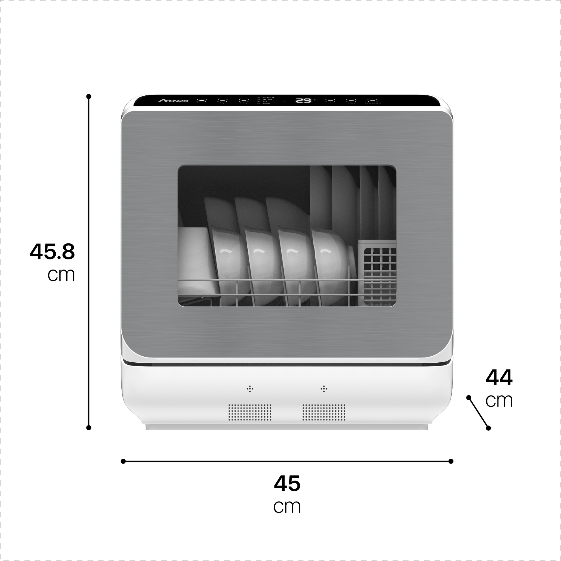 Met zijn moderne en compacte ontwerp past de Mini Vaatwasser perfect in kleine keukens. Geniet van de luxe van een vaatwasser, zelfs als je beperkte ruimte hebt! Door het ingebouwde waterreservoir is er zelfs geen wateraansluiting nodig. Ondanks het compacte formaat biedt de vaatwasser ruimte voor 4 couverts, ideaal voor een klein huishouden.